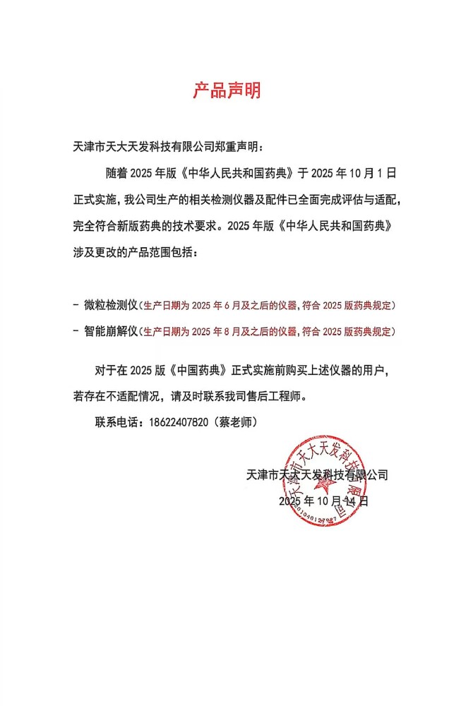 聲 明鑒于2025版《中國藥典》的更新,為保障天大天發(fā)忠實用戶的切身利益,凡在2025年之前購置我公司設(shè)備的客戶,若您的設(shè)備未能滿足新版藥典的要求,我們將提供升級服務。涉及產(chǎn)品:微粒檢測儀:GWJ-1···...